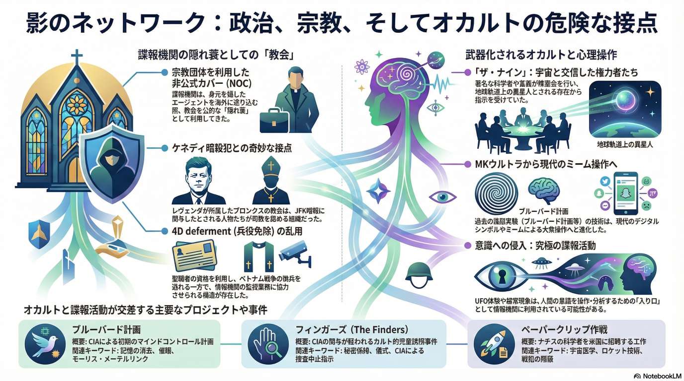 このテキストは、オカルト研究家 Peter Lavenda へのインタビューを通じて、政治、宗教、諜報活動が複雑に絡み合う現代史の裏側を紐解いています。