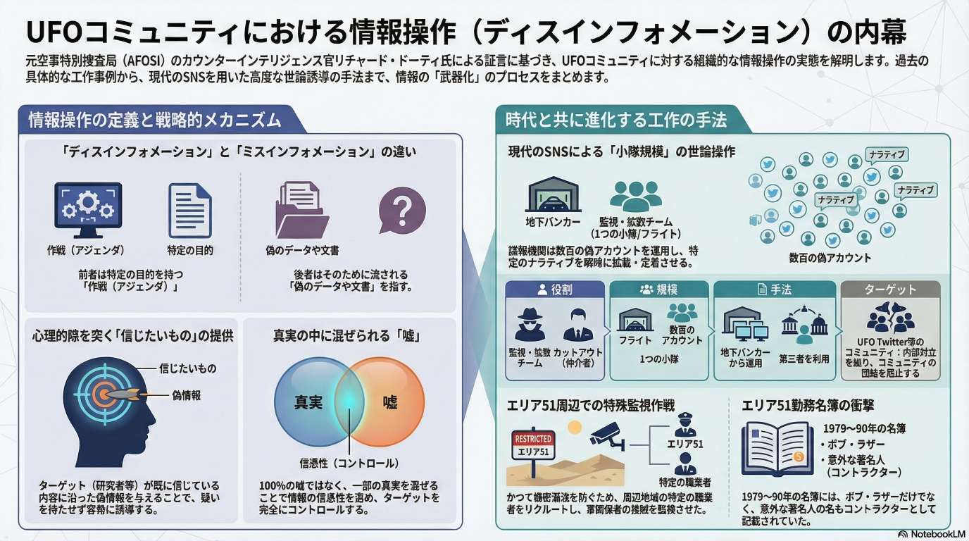 番組内では、彼が過去に従事したUFOコミュニティに対する情報操作や工作活動の実態が、具体的な事例を交えて明かされています。 Doty 氏は、政府が機密を守るために意図的に誤情報や虚偽のストーリーを流布した手法を語り、その対象が研究者やメディア、さらには一般大衆にまで及んでいたことを認めました。