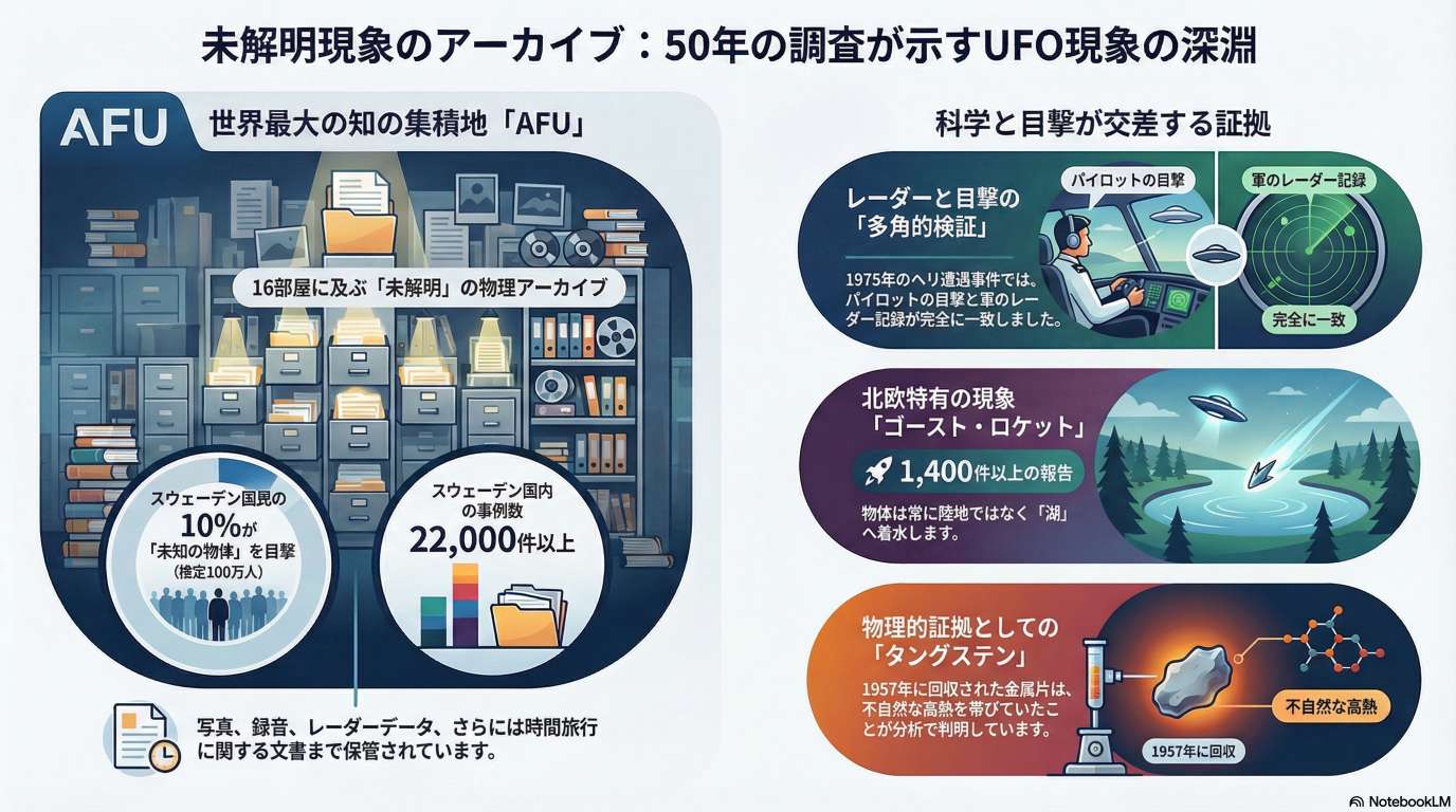 彼は1970年代から収集した膨大な目撃証言やレーダー記録、物理的証拠を基に、北欧で多発した「ゴースト・ロケット」現象や、有名なベティ&バーニー・ヒル事件の知られざる側面を解説しています。
