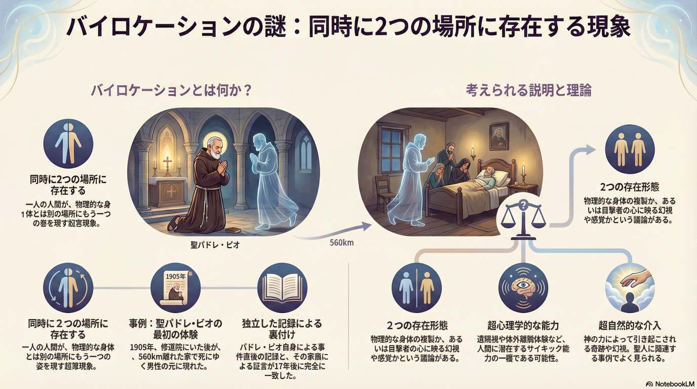 イタリアの聖人パドレ・ピオの具体的な体験談を中心に、古代の哲学者や現代の遠隔透視者による報告例が紹介されています。解説では、この現象が物理的な身体の複製なのか、あるいは非物理的な投映なのかという科学的・哲学的な仮説が提示されています。