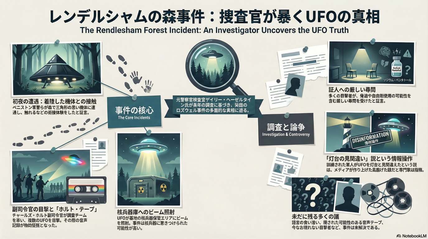 UK で起きた Rendlesham UFO 事件を、UK の UFO 研究者が地道に調査した内容を語っている。その内容を AI(NotebookLM) で整理した。