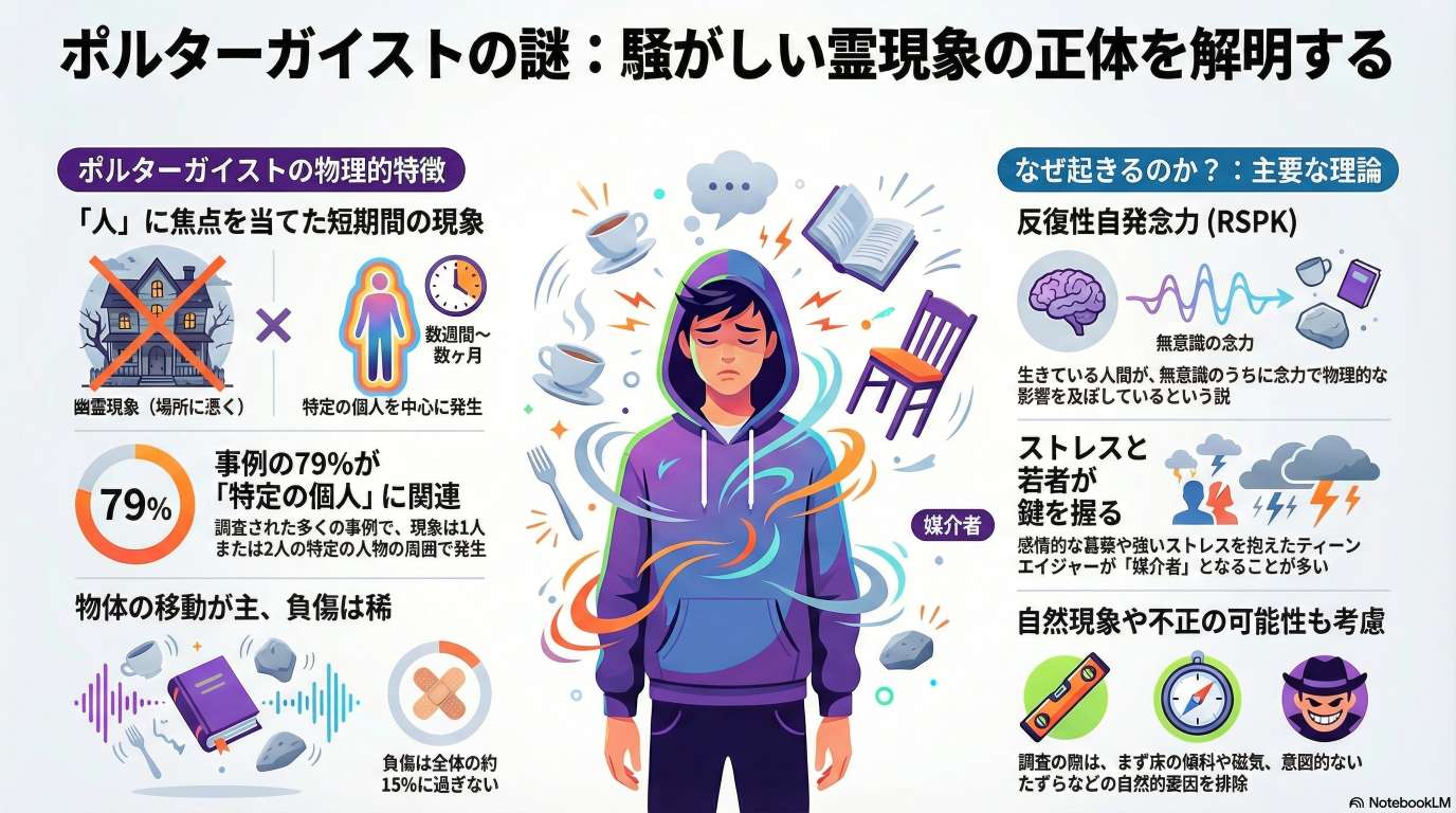 原因については、詐欺や物理的な錯覚といった自然的要因から、悪霊や幽霊、あるいは心理的ストレスが引き起こす反復性偶発性サイコキネシス(RSPK)まで、多角的な仮説を提示しています。