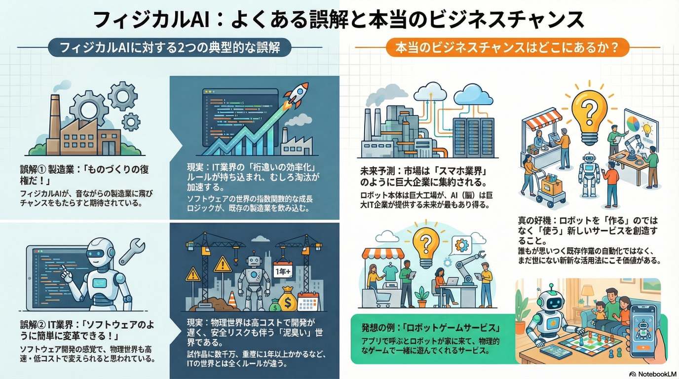 このソースは、物理世界に干渉するフィジカルAIの本質と、そこで生まれる真のビジネス機会を解説した講演内容です。