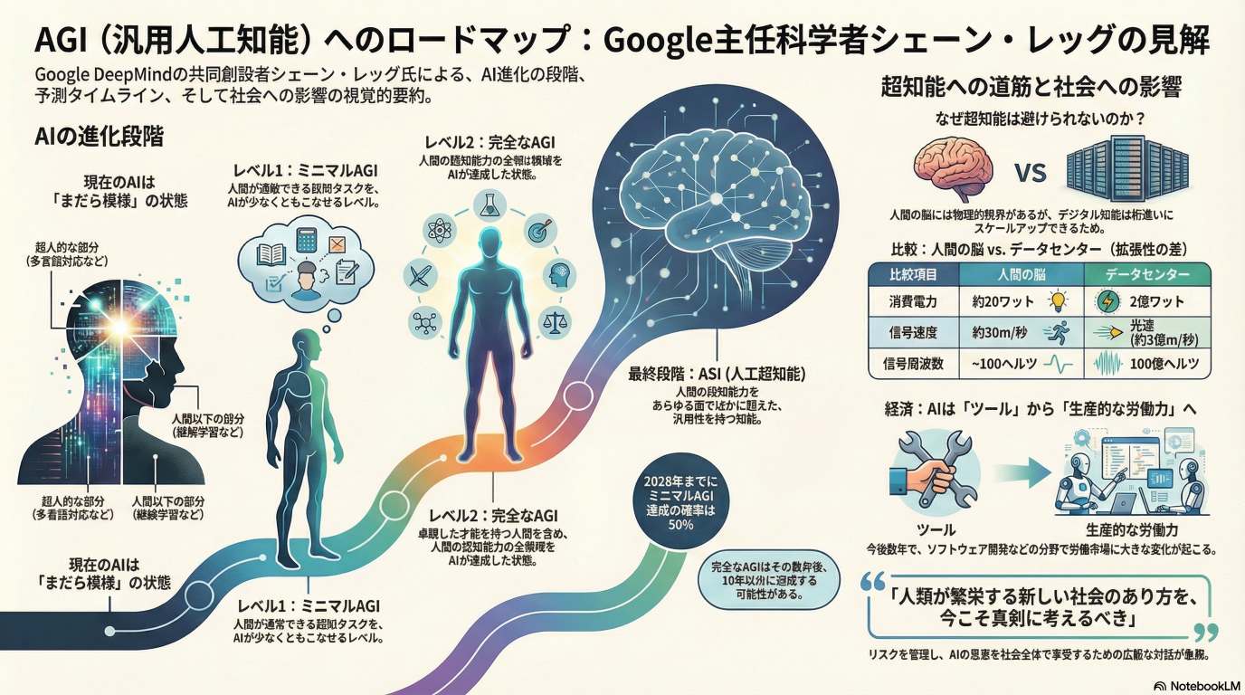 彼は、デジタル技術がエネルギーや処理速度の面で生物学的な脳の限界を遥かに超えるため、AGIの次は必然的に超知能(ASI)へ進化すると主張しています。現状のAIは言語能力には優れるものの、継続的な学習や視覚的推論に課題を残しており、これらを数年以内に克服することが次のステップとなります。