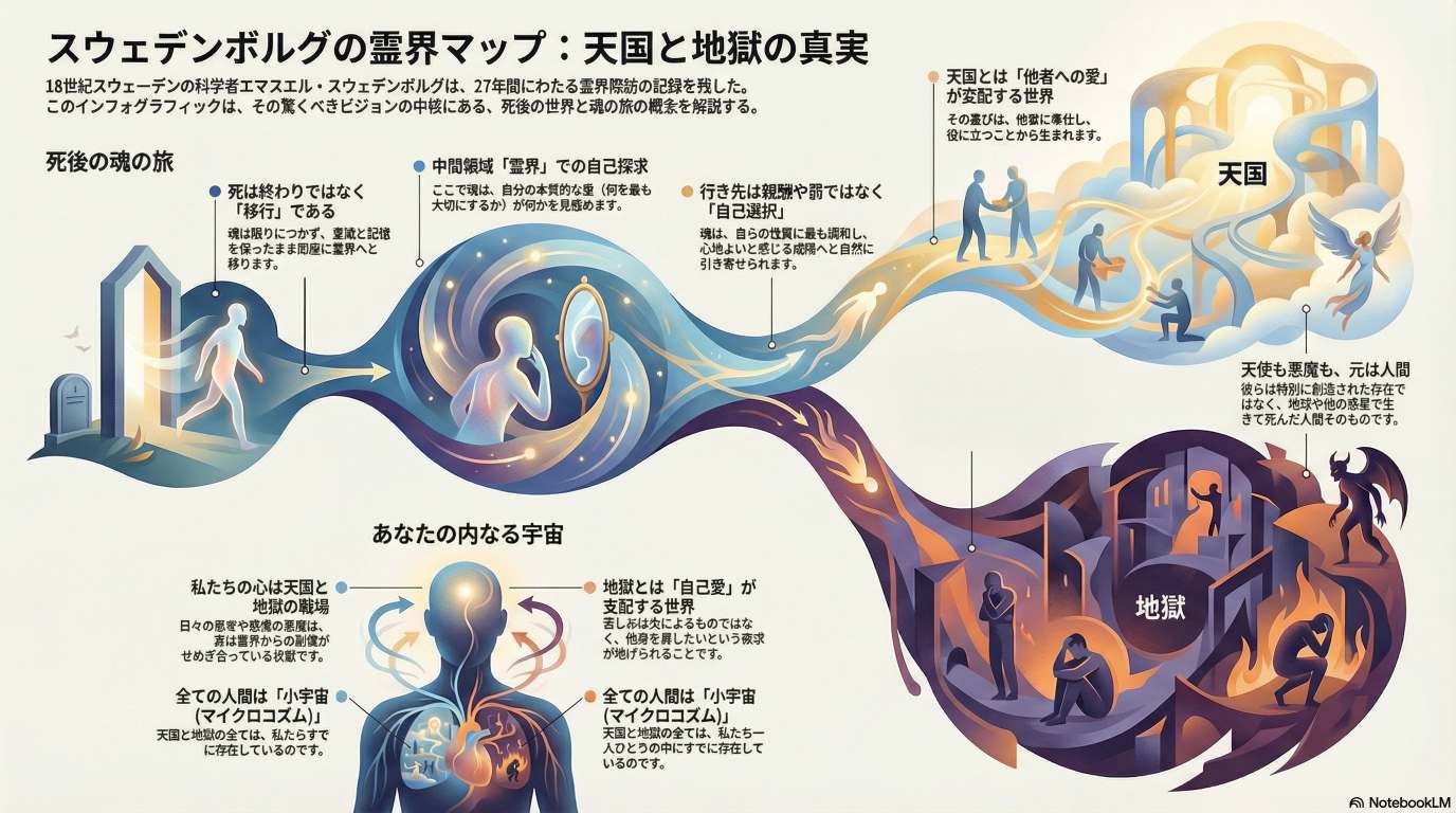 スヴェーデンボリは卓越した知性を持つ‌‌ポリマス(博学者)‌‌でありながら、50代で霊的な覚醒を経験し、死後の世界との交流を日常的に行うようになった特異な人物として描かれています。彼は、死後すぐに赴く「霊界」を経て、個人の‌‌愛と信念‌‌に基づき天国か地獄へと導かれるという、独自の階層的な死後構造を詳述しています。