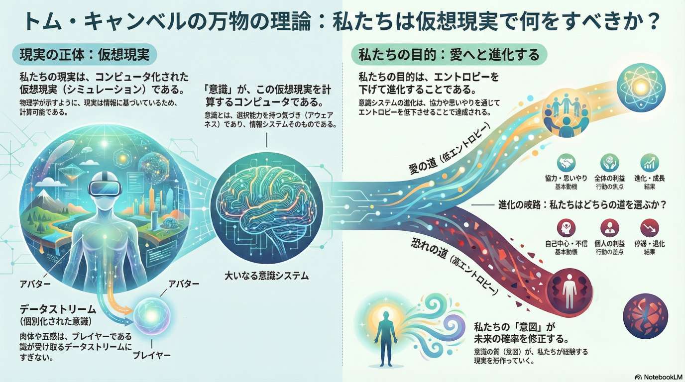 Tom Campbell の主張 AI(NotebookLM) で整理した。彼の主張する仮説(Big TOE)は、矛盾しているだけではなく、裏付けゼロ、反証可能性が皆無な上に、一片の独創性もない。本当にどうしようもないレベル。