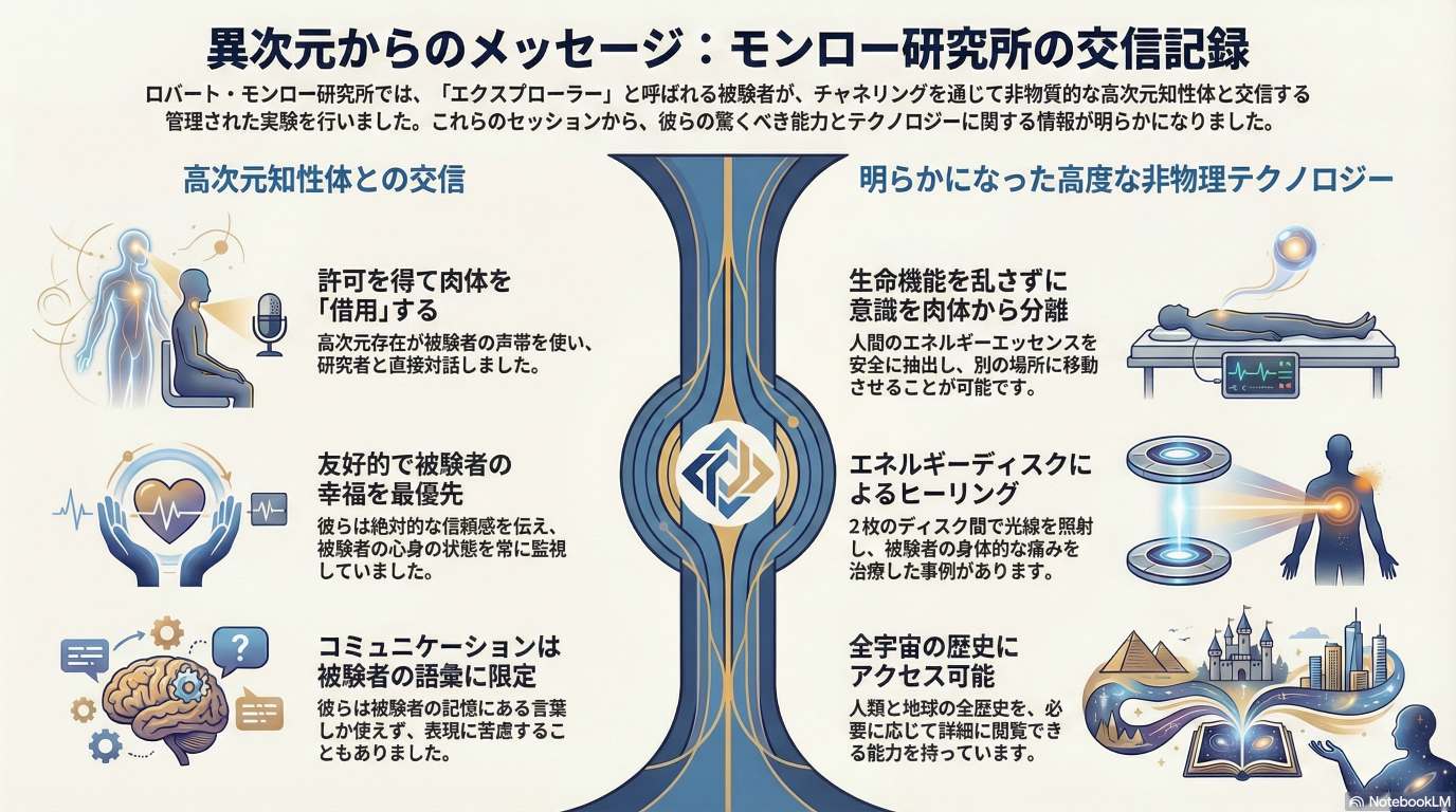 また、未知の光エネルギー技術を用いた身体の治療や、非言語的な意思疎通の重要性についても詳細に触れています。最終的に、人間は単なる肉体を超えた多次元的な存在であり、死後も意識は継続していくというメッセージが強調されています。