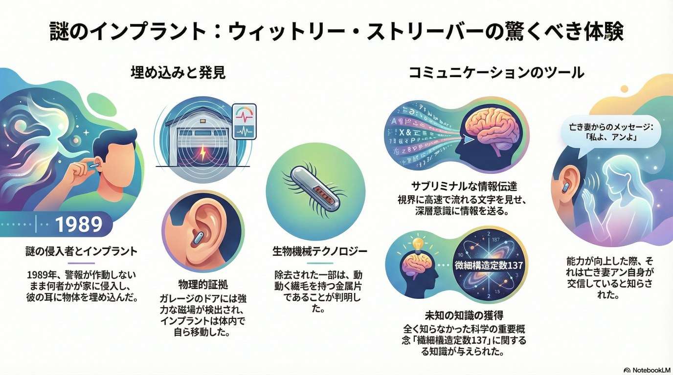 彼は1989年に‌‌耳にインプラント‌‌を埋め込まれた不可解な出来事から、それが現在の創作活動や‌‌予知的な情報収集‌‌に役立つツールへと変化した経緯を詳述しています。対談では、亡き妻 Anne との‌‌死後コミュニケーション‌‌や、異次元の存在との接触が単なる技術的現象ではなく、‌‌魂の進化‌‌や死生観に深く関わっていることが示唆されます。