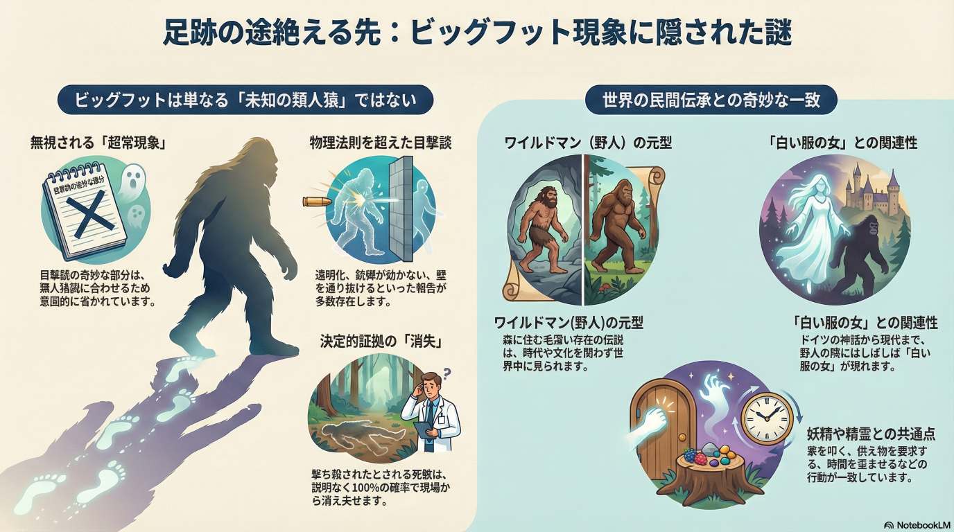 彼らは、ビッグフットを単なる‌‌未発見の類人猿‌‌と見なす従来の枠組みを超え、‌‌超常現象‌‌や‌‌伝承(フォルクロア)‌‌の視点から考察しています。具体的には、遭遇時に報告される‌‌発光体‌‌や‌‌テレポート‌‌、‌‌「白い服の女」‌‌の幽霊との奇妙な関連性など、物理法則では説明しきれない多くの事例が紹介されています。