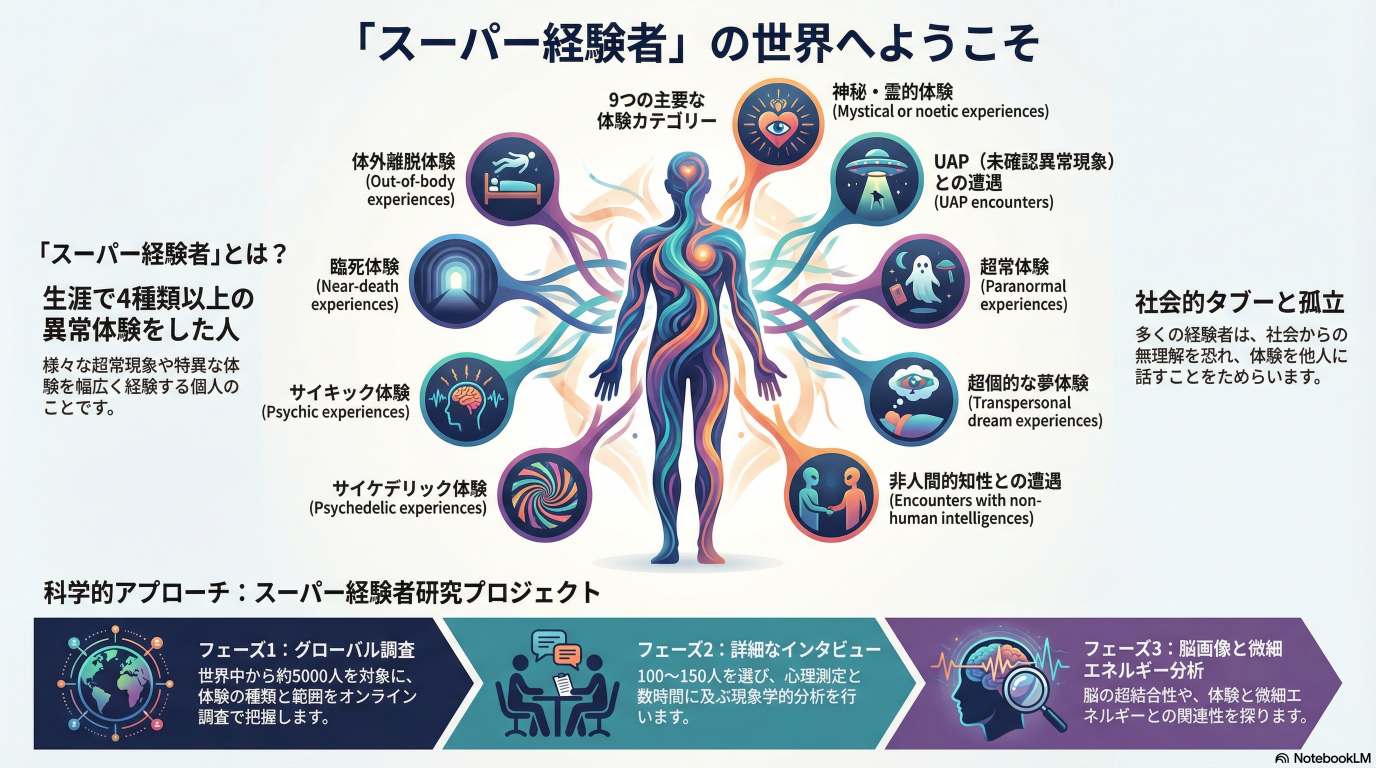 エスビョルン=ハーゲンスは、臨死体験、非物質的な知性との遭遇、UAPとの遭遇など、複数の「異常なカテゴリーの経験」を四つ以上持っている個人をスーパー体験者と定義しています。彼は、この現象が一般的に考えられているより も遥かに普遍的であると仮定し、ポスト唯物論的科学の枠組みを用いて、心理測定評価、詳細なインタビュー、将来的な脳画像解析を含む6年以上にわたる包括的な研究を計画しています。