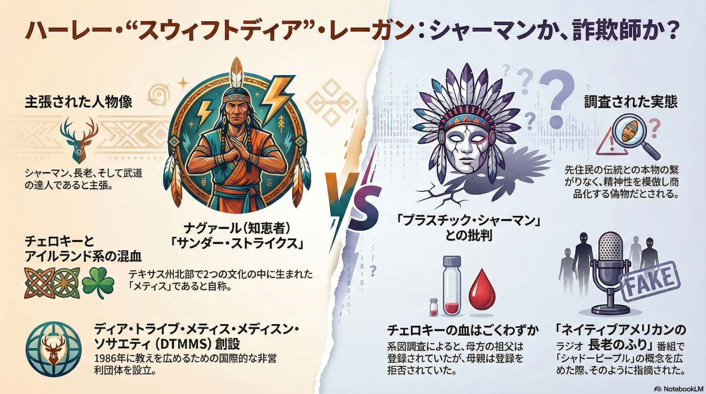 このソースは、伝統文化を盗用して独自のスピリチュアル・ビジネスを展開した「偽シャーマン」としての彼の生涯を批判的にまとめています。
