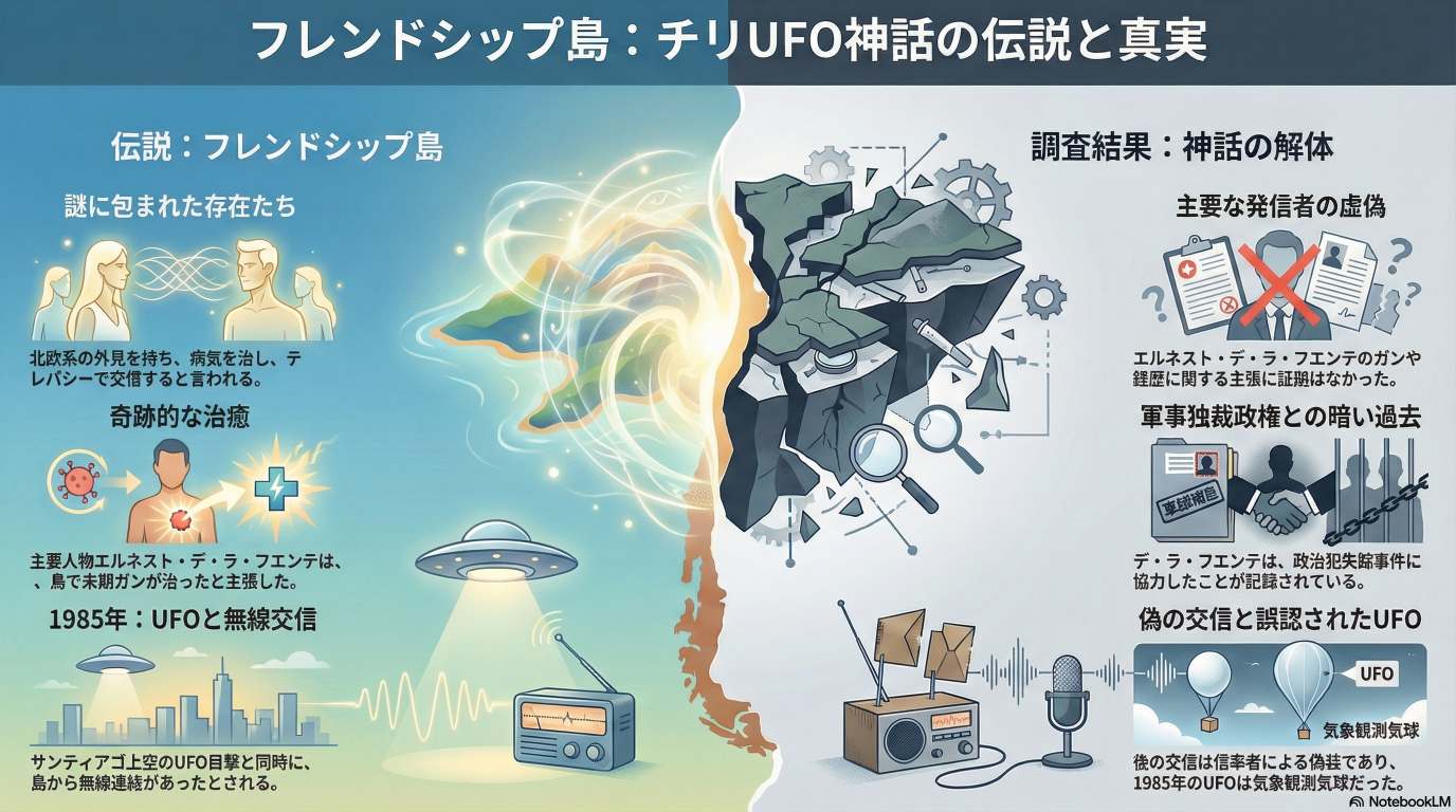 たまたま La isla Friendship, Ovni という文字列が目に入ったので AI(NobebookLM) で関連するスペイン語情報を整理した。10件のソースの収集も AI に任せ、整理させた。