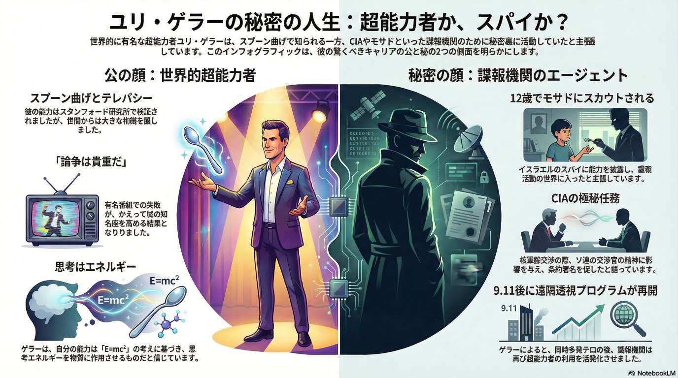 このブリーフィングは、著名な超能力者ユリ・ゲラー氏が受けたインタビューの記録を分析し、彼の公的な活動の裏に隠された、諜報機関との協力関係という二重生活の核心をまとめたものである。ゲラー氏は、自身のテレパシーやリモートビューイング(遠隔透視)といった能力が、CIAやモサドなどの情報機関によって科学的に検証され、国家間の機密作戦に利用されたと証言している。