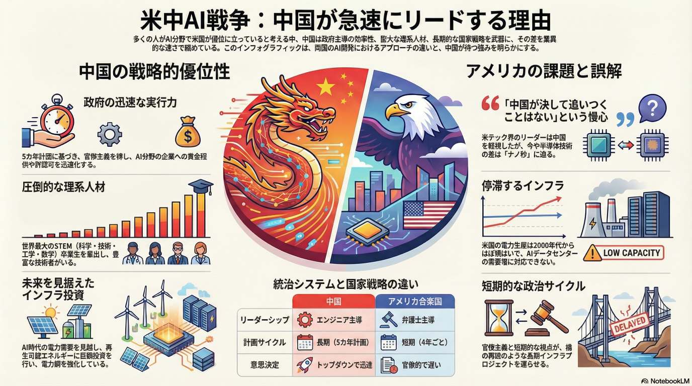 元の記事は、米国と中国の間で激化するAI競争に焦点を当てたインタビューの記録であり、中国の技術的優位性の高まりを強調しています。