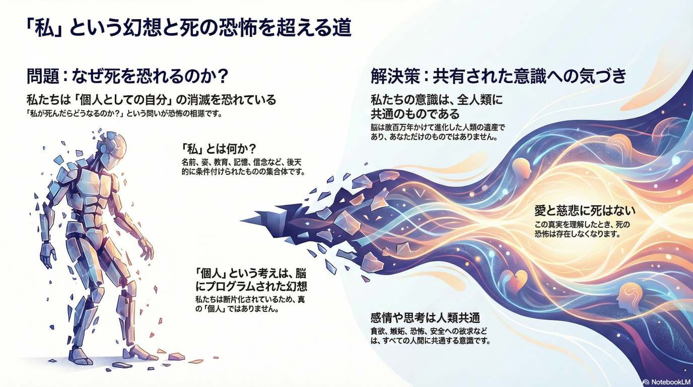 - 普遍的意識の実現: もし自分の意識が人類共通の意識の現れに過ぎないという事実を真に体得すれば、「私」という恐怖の主体は意味をなさなくなる。