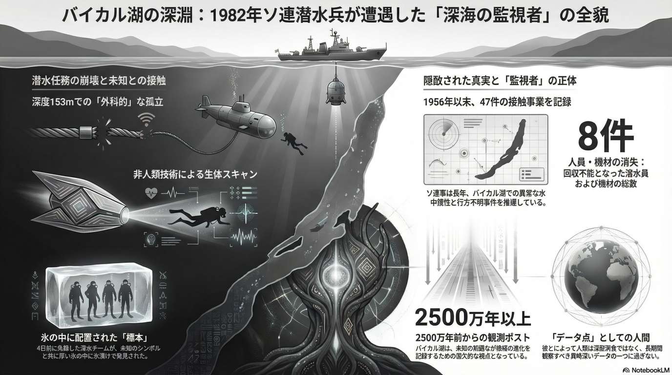 1982年、ソ連の潜水士がバイカル湖で遭遇した未確認事象の記録です。機密任務中、深海で未知の高度なテクノロジーを持つ存在に遭遇し、仲間は氷の中に保存されました。彼らは人類を長年観察・収集する「深淵の監視者」であり、その真相は隠蔽されていま す。