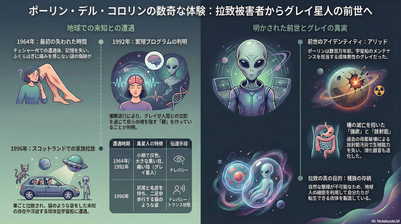 Pauline Delcour-Min の事例 : 退行催眠で ET だった過去世を想起February 1, 2026 · 138 min read (全体俯瞰 : AI 生成) click で拡大 前置き Web にこの事例に関する複数の記事が掲載されているので、動画制作者の捏造ではないようだ。最近、(情報源皆無で想像だけで作り上げた)捏造動画を見かける頻度が高くなったので疑う癖がついた。 要旨 AI英国の Pauline は、催眠退行により Alien abduction の記憶を想起しました。彼女は、グレイが絶滅を免れるため人間との交配プログラムを行っていると主張。さらに前世で自らがグレイだった記憶を持ち、魂の輪廻転生と宇宙的 起源の繋がりを説いています。 目次 前置き 要旨 Pauline Delcour-Min の体験:地球外生命体による誘拐、過去世、そして人類との関係性に関するブリーフィング 要旨 1. 最初の事件と記憶の再浮上 2. 催眠退行によって明らかにされた誘拐の詳細 3. 過去世回帰:グレイとしての前世 4. 結論と考察 Pauline Delcour-Min の驚くべき旅:異星人グレイとして生きた過去の記憶 1. はじめに:チェシャーの田園地帯で起きた謎 2. 封印された記憶の扉 3. 催眠が明らかにした最初の接触 5. 過去生への退行:私はグレイだった 6. 物語が示唆するものと、残された問い