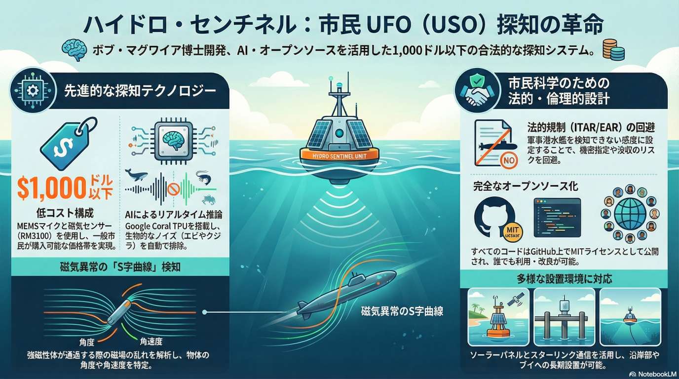 Bob McGwier 氏は、UFO/USO(未確認潜水物体)を低コストで検知する市民参加型システムを開発中です。AI(機械学習)や磁気センサー、水中マイクを活用し、軍の機密に触れない範囲で科学的データを収集。コードはGitHubで公開予定です。