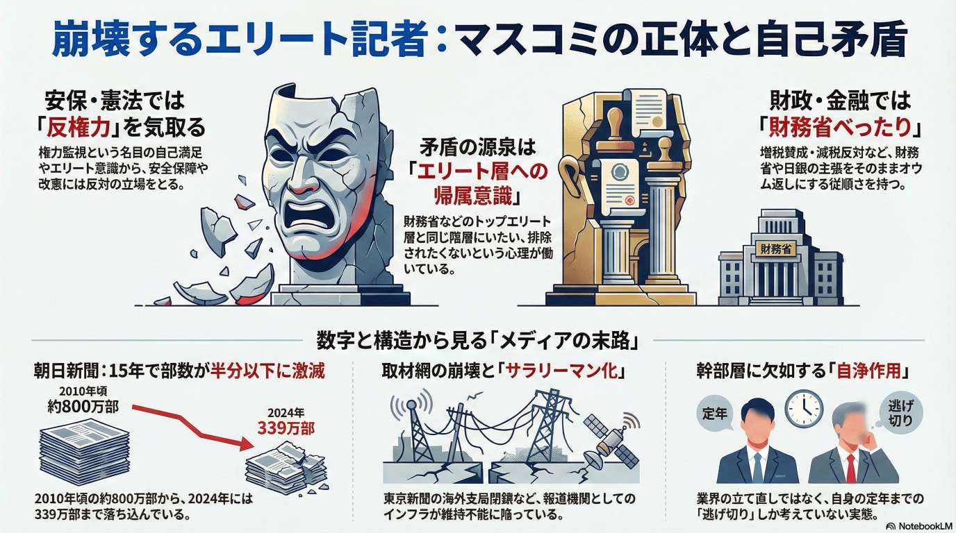 マスコミは安全 保障や憲法問題で「権力監視」を掲げながら、経済政策では財務省などのエリート層に同調するという、深刻な自己矛盾を抱えていると指摘しました。彼らが高い意識を装う背景には、特権階級のサークルから排除されたくないという特有の選民意識と保身が存在しています。