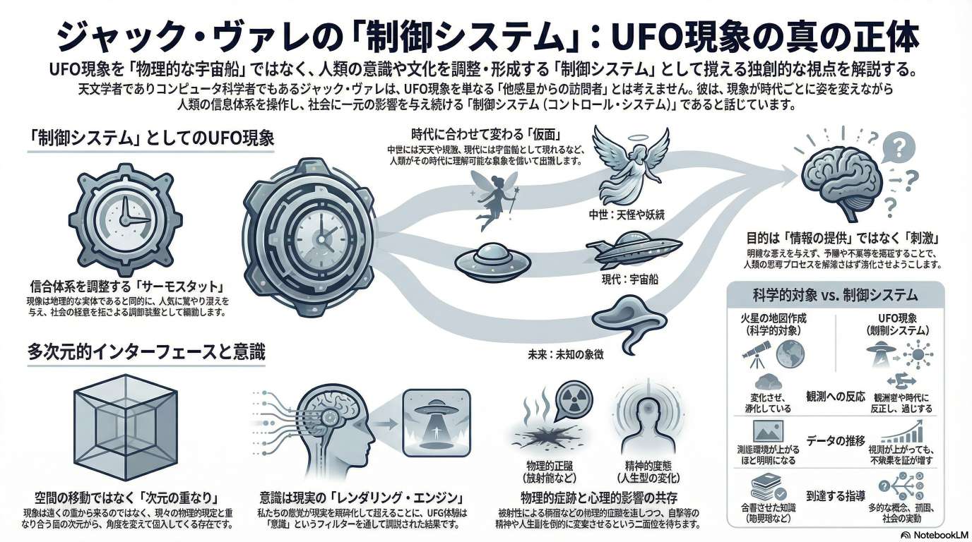 が解説した動画を AI(NotebookLM) で整理した。Jacqeus Vallee 本人は登場しない。 内容はこの人物が理解した Vallee の主張であり、この人物独自の解釈もかなり混入している(*1)ので、Vallee の主張を誇張・拡大解釈しているとも言える。