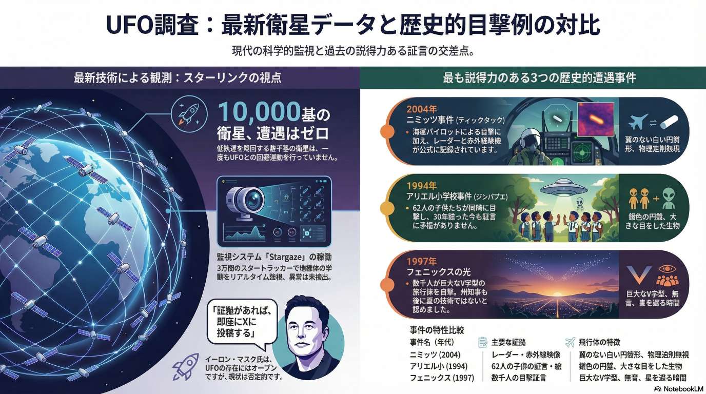 イーロン・マスク氏がスターリンク衛星を通じて未確認飛行物体を確認していない現状に触れつつ、衛星の追跡技術が未知の物体を検知できる可能性を考察しています。
