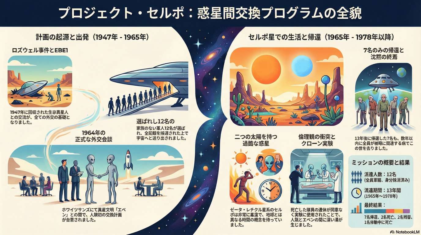この物語は、ロズウェル事件で回収された生存宇宙人との対話を通じて、米軍の精鋭12名がゼータ・レティクル星系へと交換留学に旅立ったという驚くべき主張を軸に展開されます。