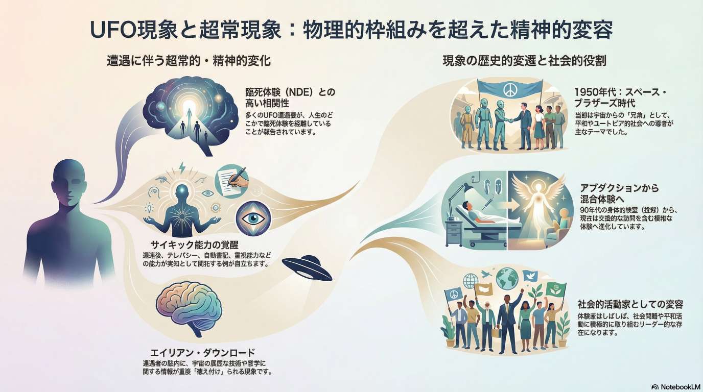 本報告書が提示するのは、UFO遭遇が単一の視覚的イベントに留まらず、臨死体験(NDE)やサイキック能力の発現、ポルターガイスト現象といった広範なパラノーマル現象と地続きであるという統合的視座である。歴史を俯瞰すれば、1940年代から50年代の「スペース・ブラザーズ」による友好的接触から、より侵襲的な「アブダクション」、そして現代の「混合型・霊的訪問」へ と現象の表出形態は進化を遂げてきた。これらの変遷は、現象そのものが人間の意識の成長段階に即した「イニシエーション(開始儀礼)」として機能していることを示唆している。