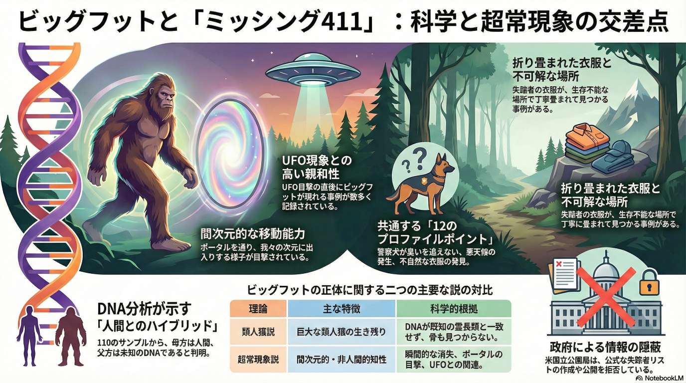 このテキストは、元法執行官であり研究者の David Paulides 氏へのインタビューを通じて、 Bigfoot や謎の失踪事件「Missing 411」に焦点を当てています。